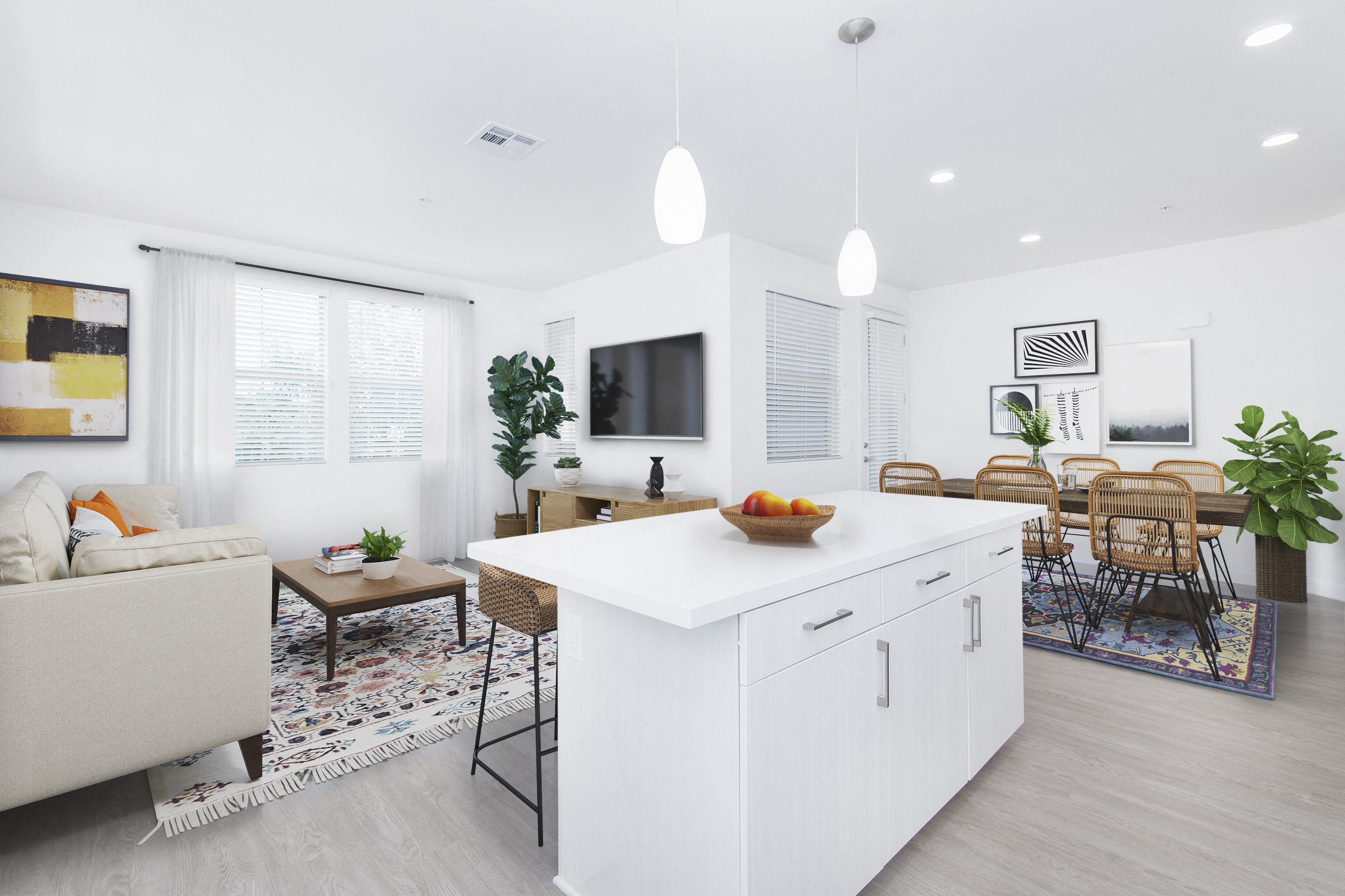 Quartz counter tops and island waterfall in kitchen.